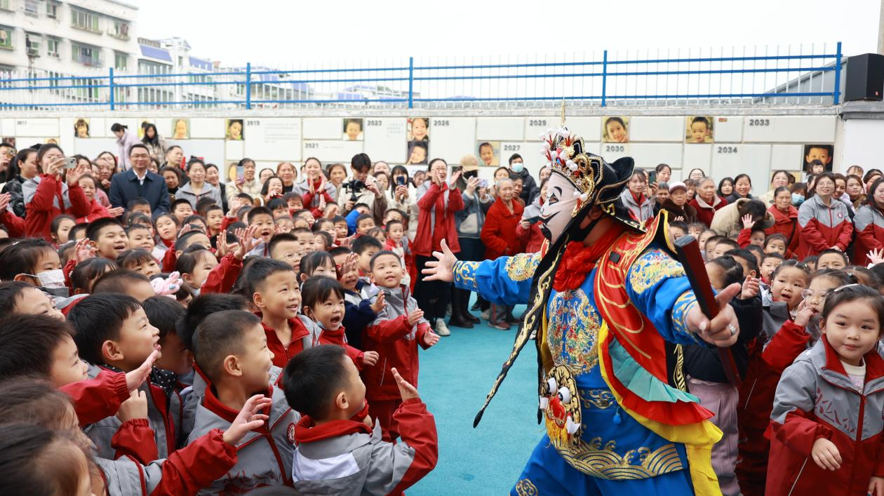非遗表演环节将活动推向高潮。国家级非物质文化遗产川剧变脸的神奇变幻、重庆市级非物质文化遗产龙孔戏牛的诙谐灵动,让家长和孩子们近距离感受非遗的独特魅力