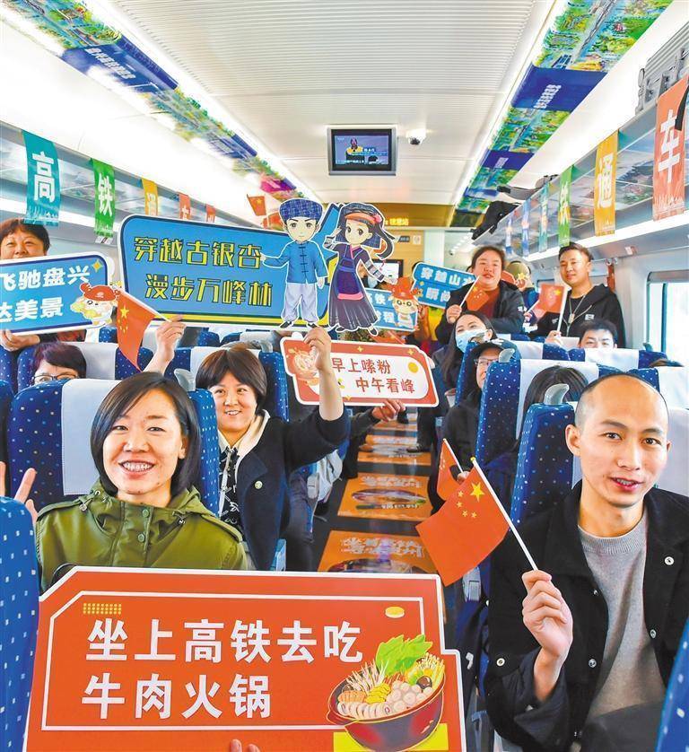 11月28日,旅客在盘兴高铁首发列车上庆祝通车。盘兴高铁开通后,兴义到贵阳仅需2小时。 刘 青摄(中经视觉)