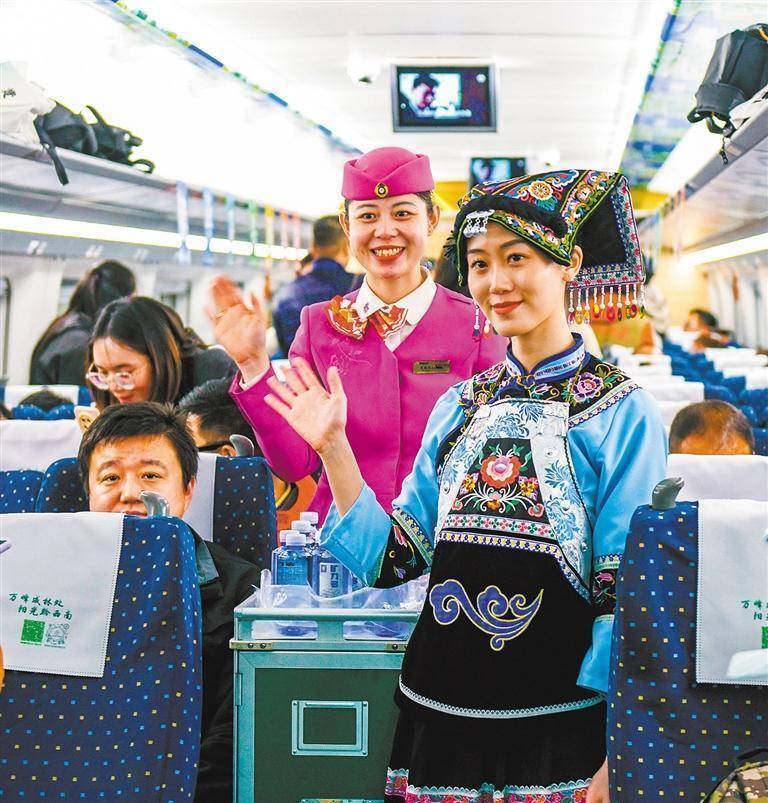 11月28日,盘兴高铁首发列车上,身着民族服饰的乘务员为乘客提供服务。 刘朝富摄 (中经视觉)